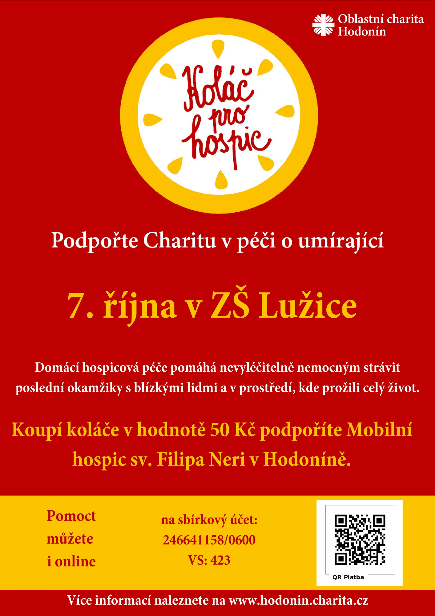 v úterý 7.října 2025 budou mít žáci naší školy - podobně jako v minulých letech - možnost zakoupit si koláč, kterým podpoří sbírku v rámci charitní akce "Koláč pro hospic". Cena koláče je 50,- Kč. Výtěžek ze sbírky je věnován hospicům v Jihomoravském kraji, které pečují o umírající. Podstatou domácí hospicové služby je poskytnout nevyléčitelně nemocným pacientům kvalitní péči v domácím prostředí, kterou zajišťuje oblastní charita v Hodoníně a přilehlých obcích.